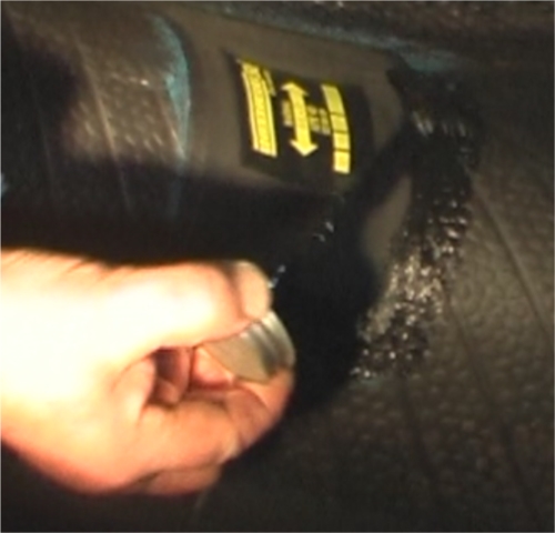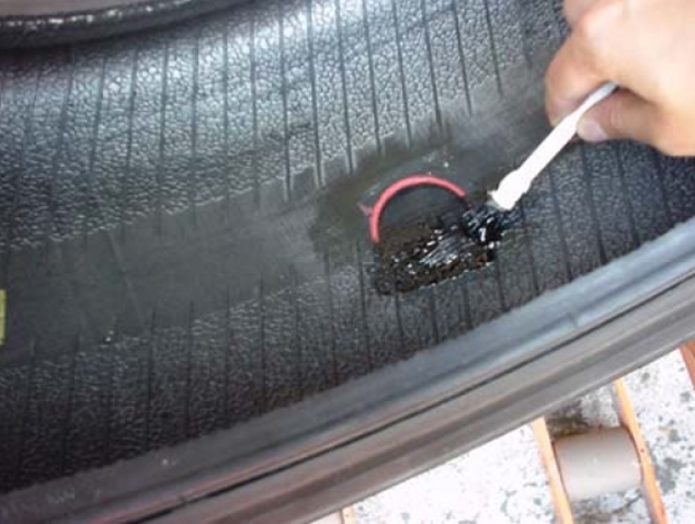 Schwarze dickfluessige Loesung zum Ueberstreichen von zu groß aufgerauten Reparaturstellen an der Reifeninnenseite